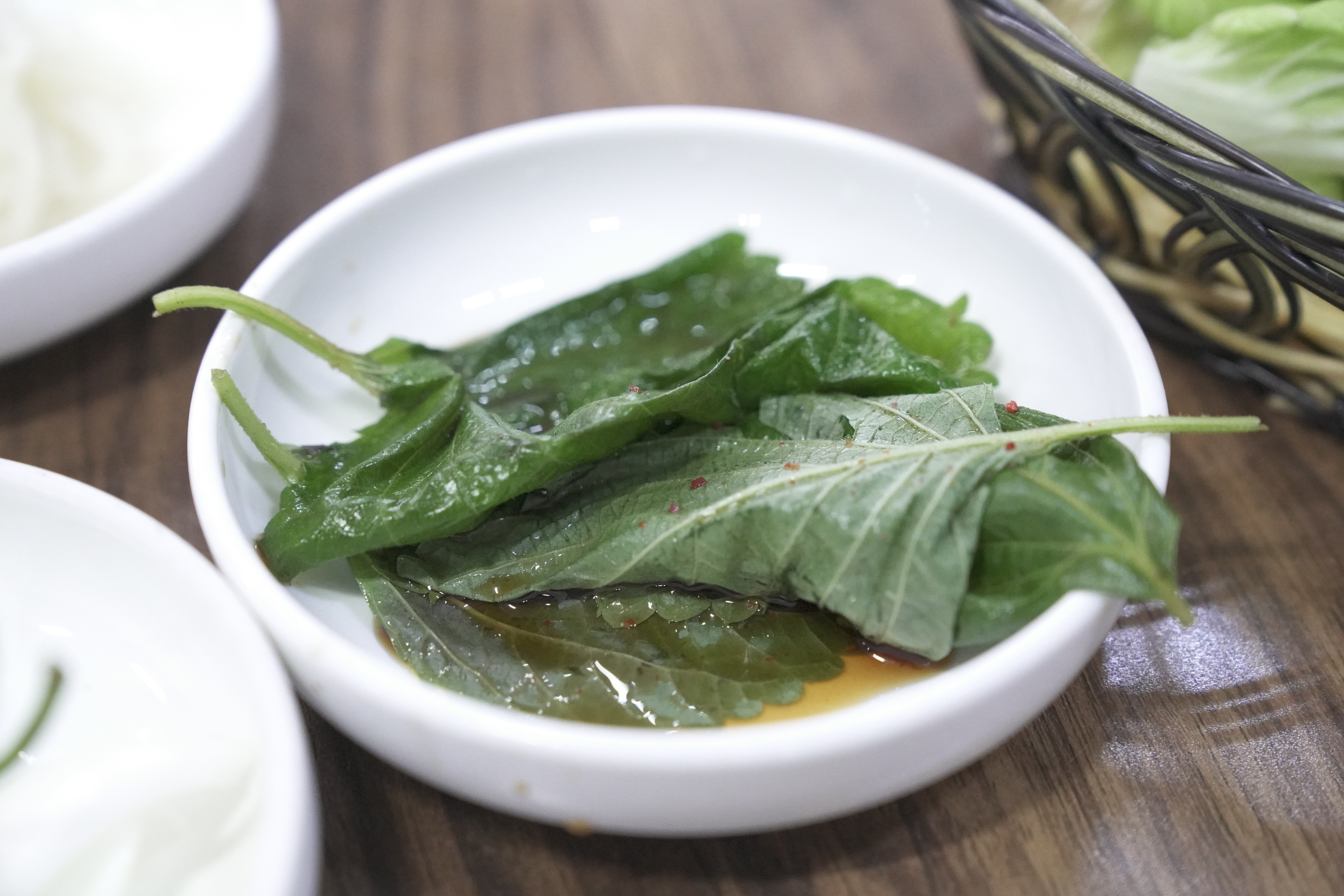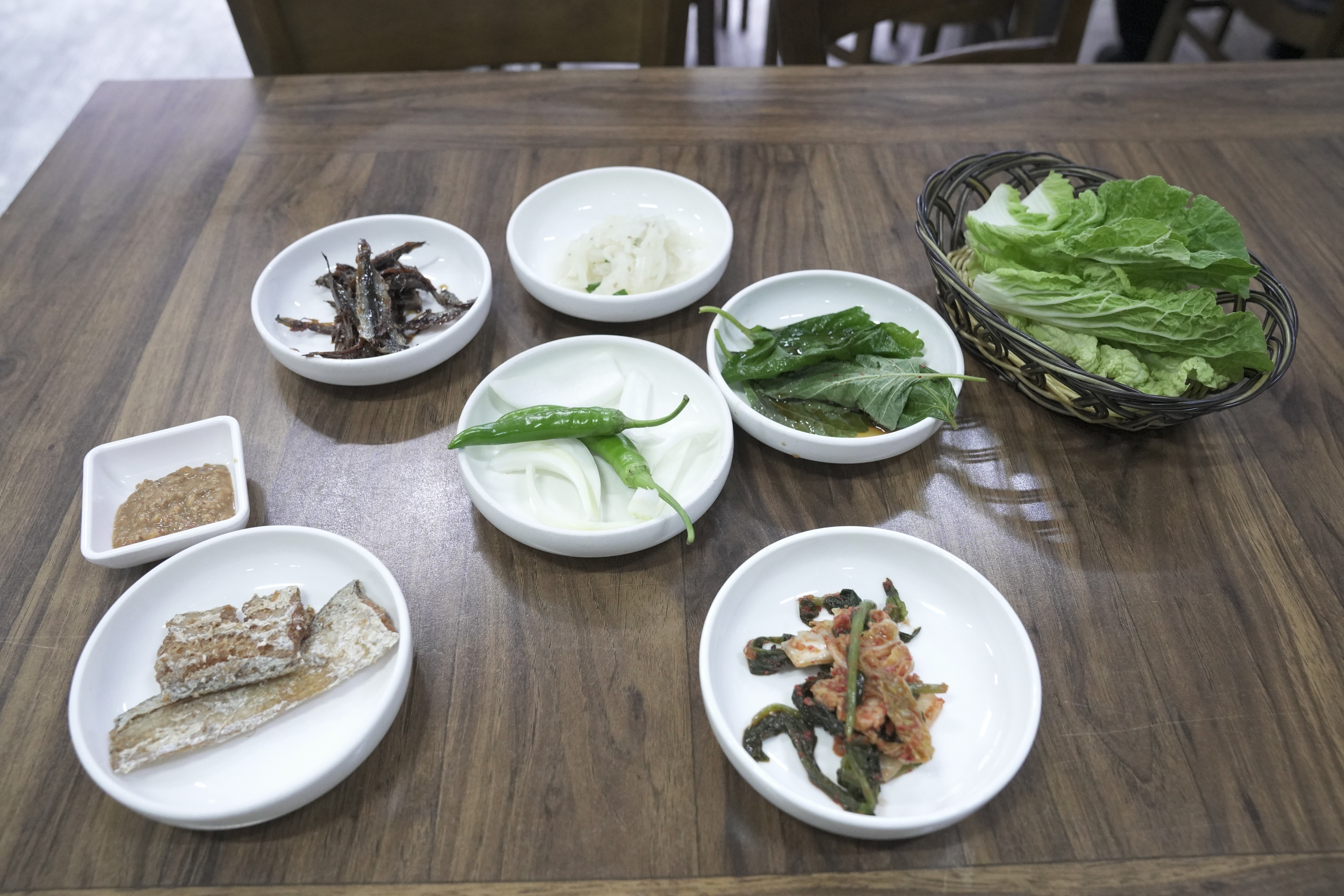 아주머니가 옆에 마늘이랑 고추를 넣어 먹으라고 합니다
