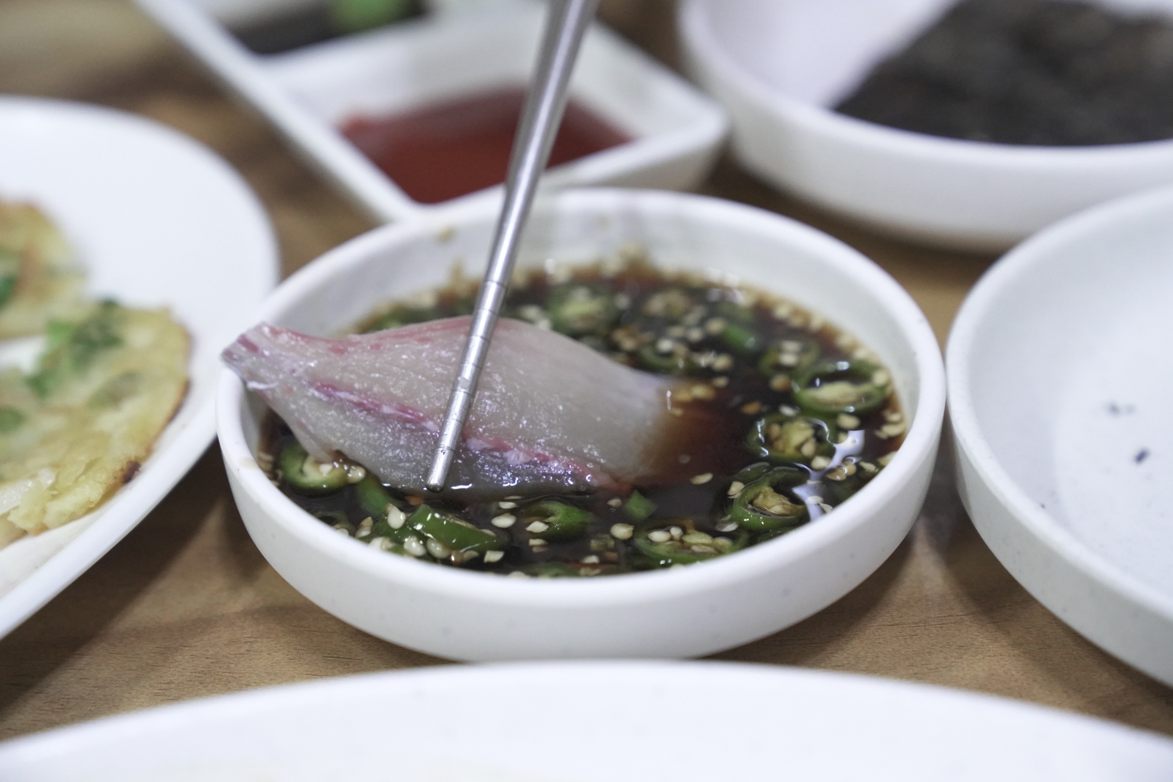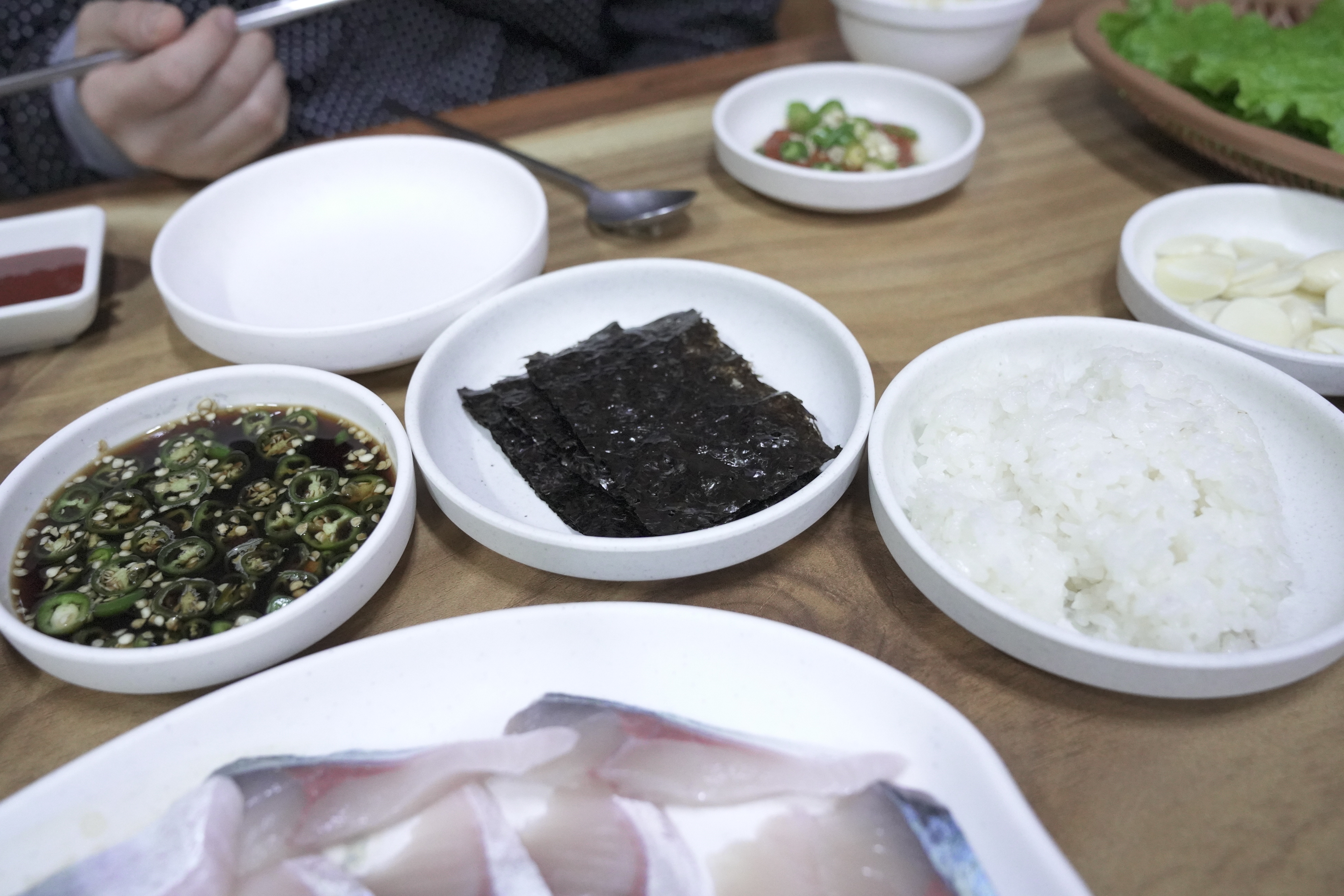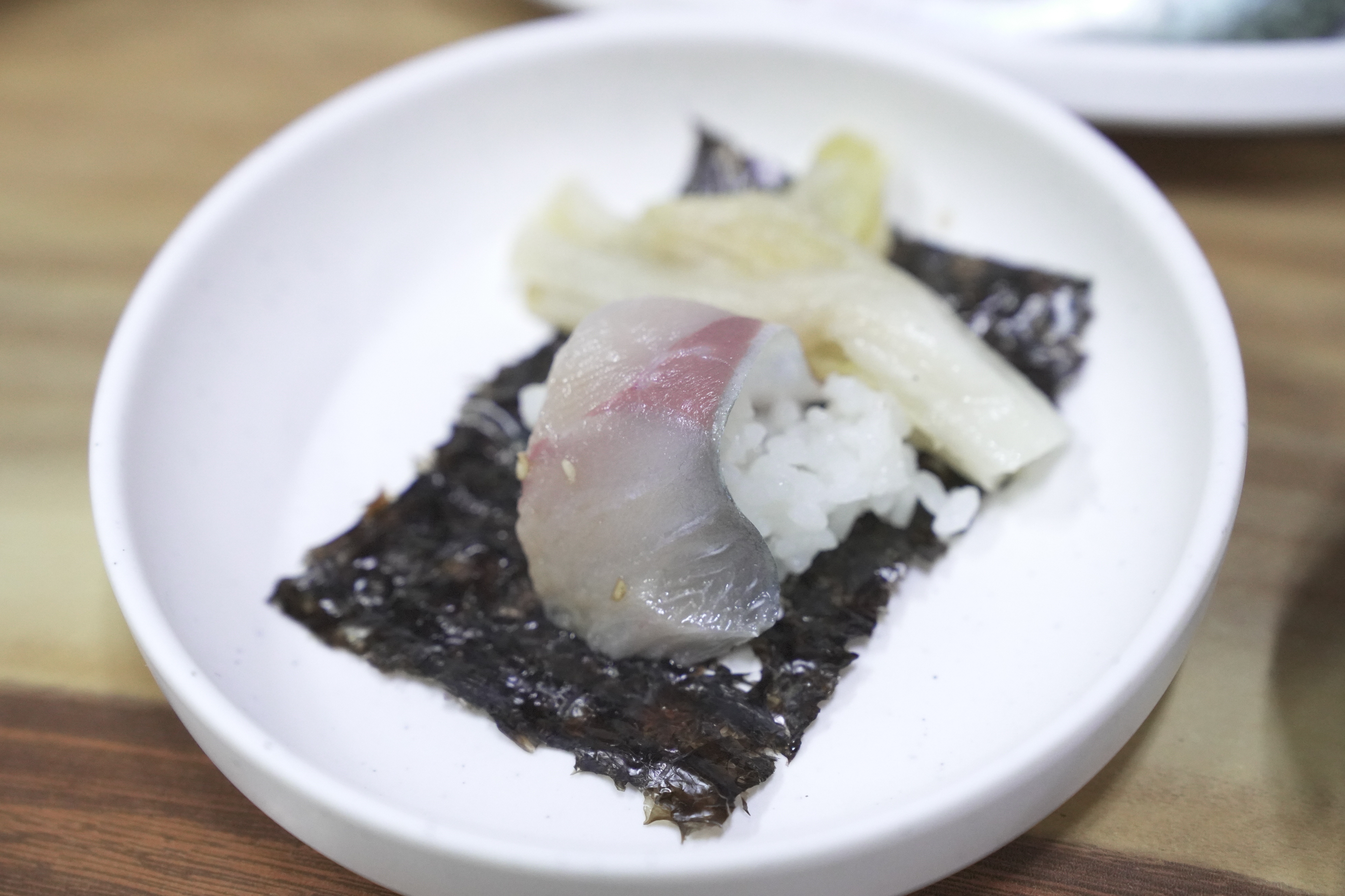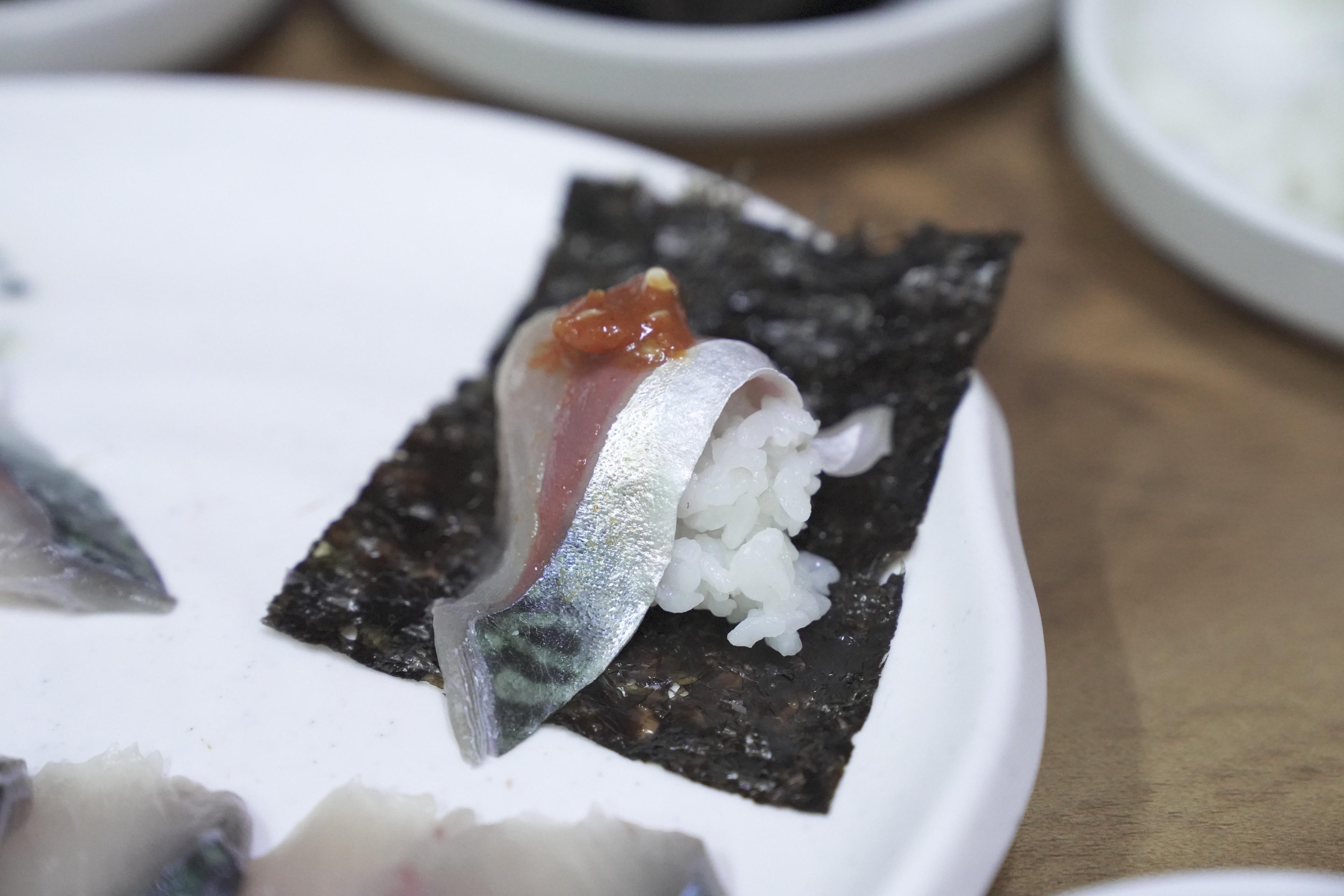 직원분이 알려주신 대로 고등어회를 소스에 찍고 김 위에 올려서 밥과 백김치와 함께 먹어보았습니다