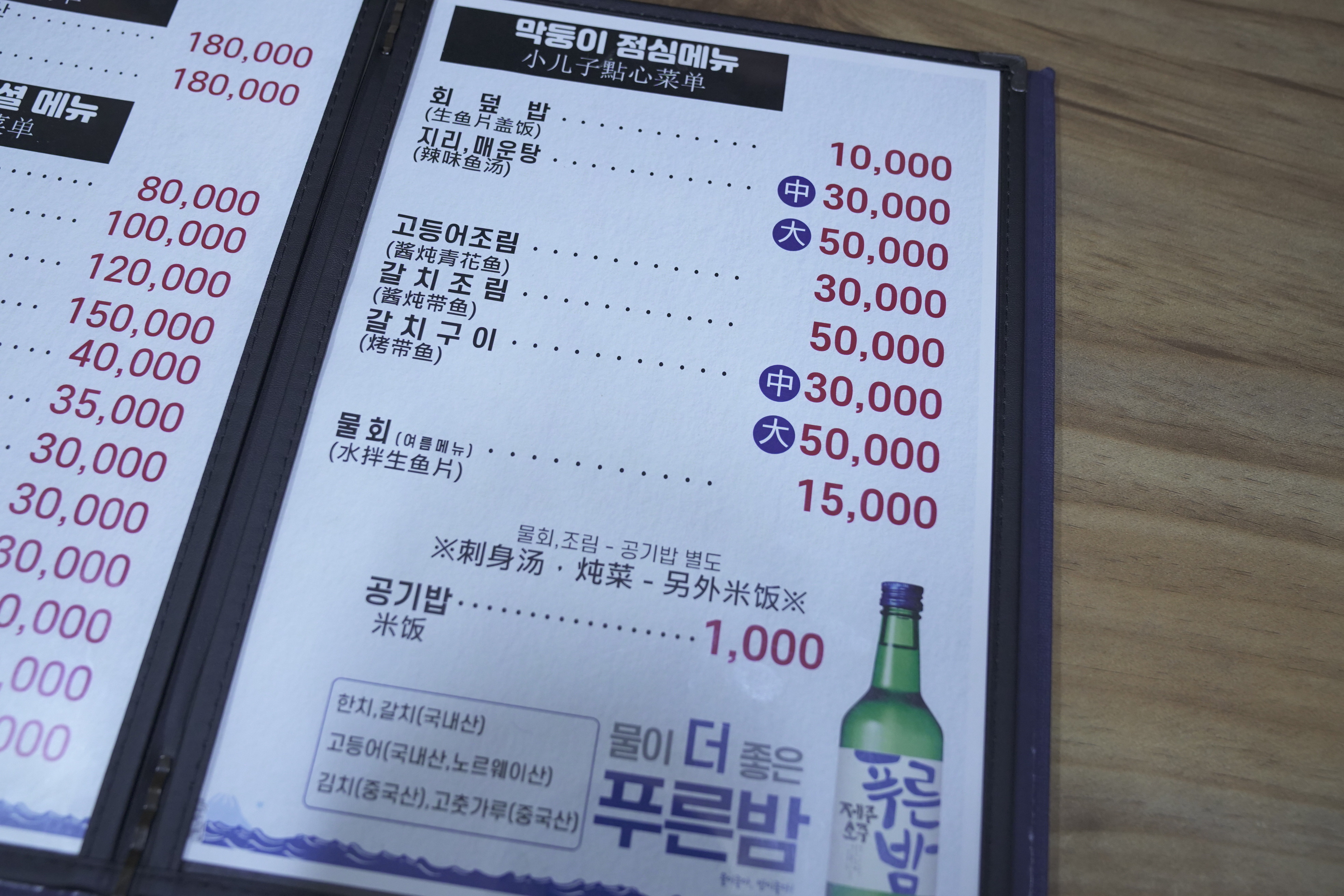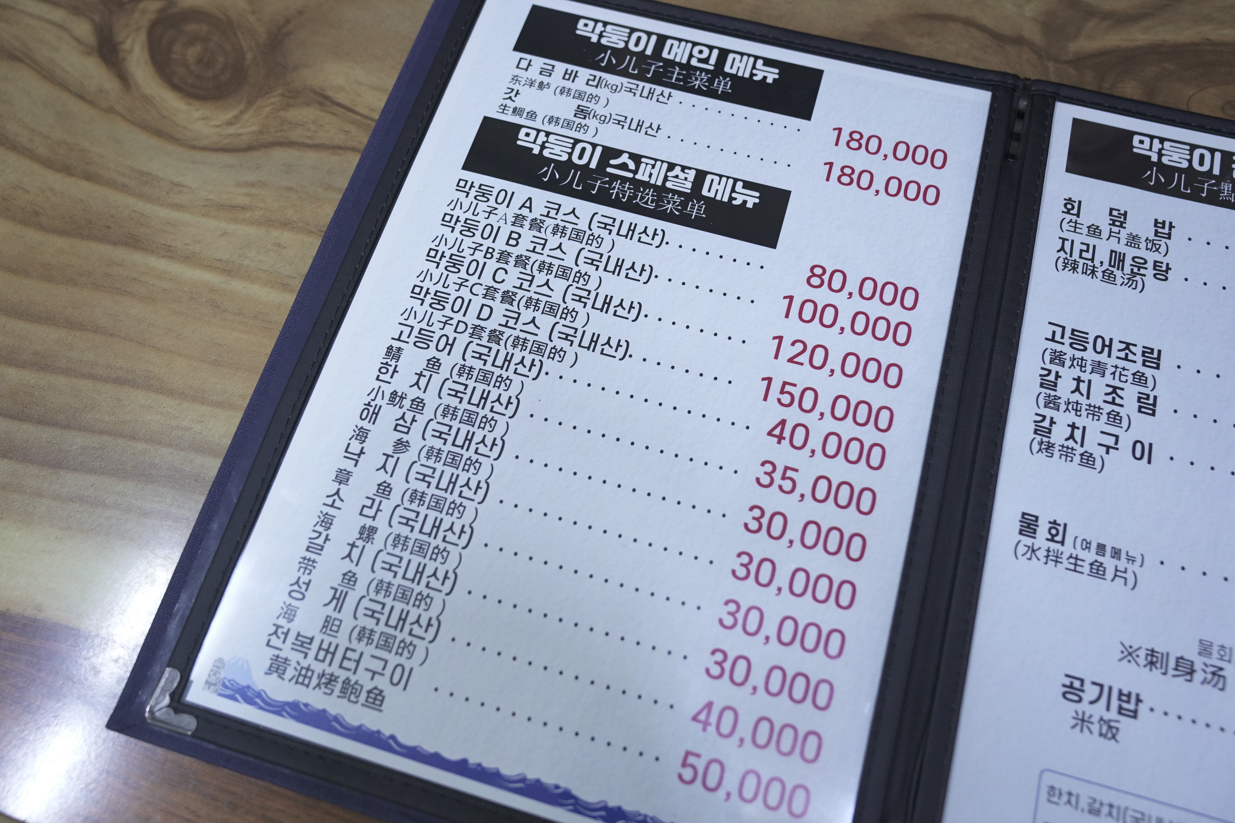 막둥이횟집 메뉴판입니다