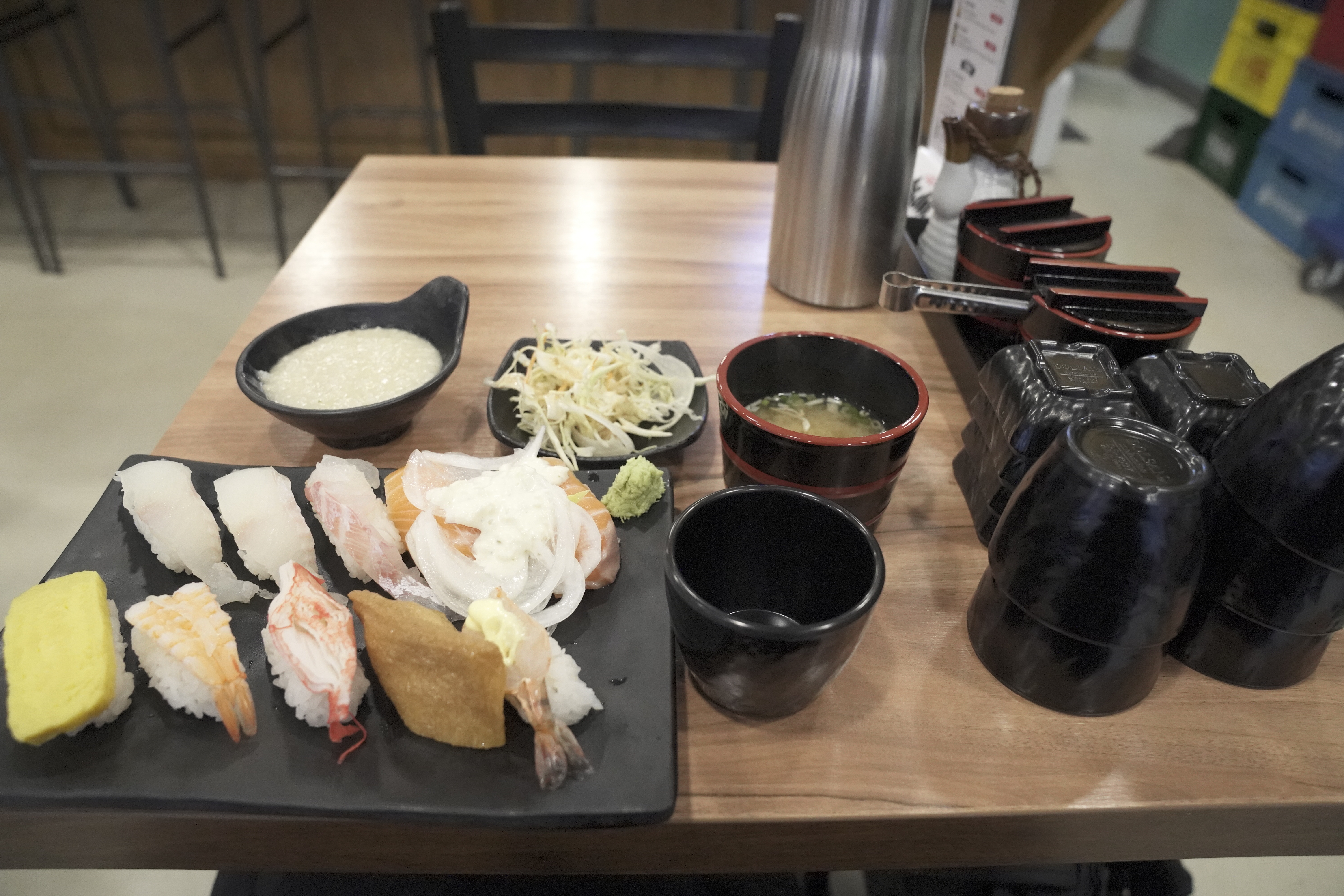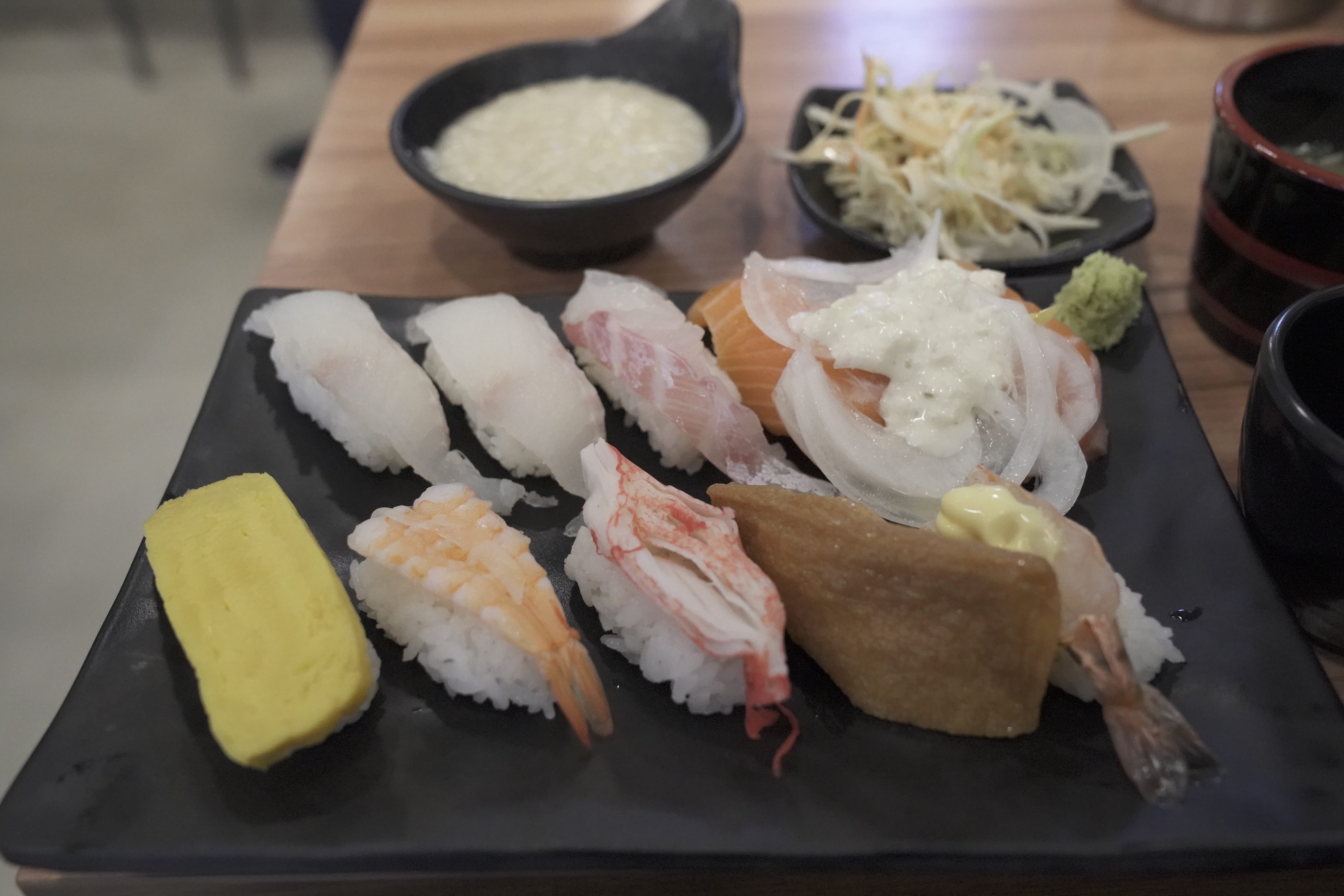 주문한 점심 특선이 나왔습니다. (초밥 10피스, 죽, 샐러드)